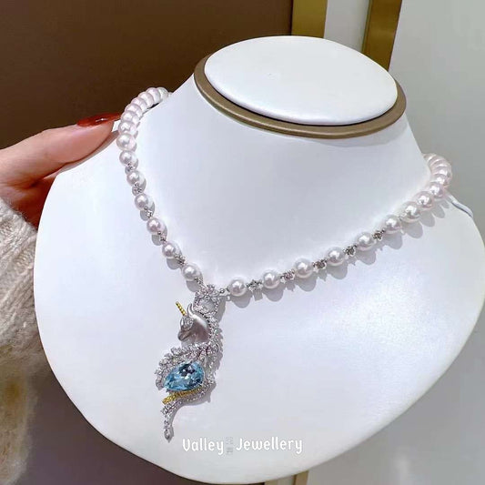 Unicorn 18K Gold Aquamarine with Pearl Necklace