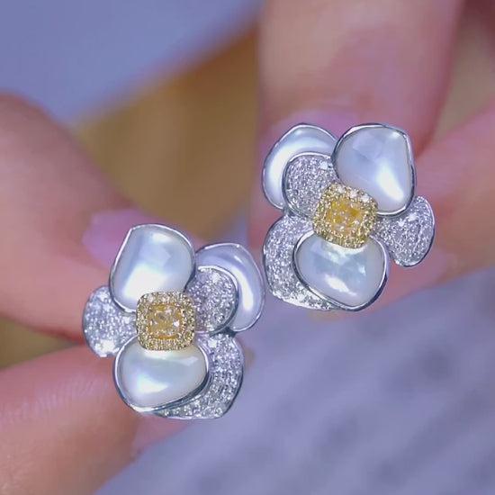 18K Mother of Pearl with Yellow Diamond Flower Earrings
